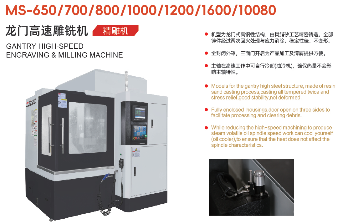机型为龙门式高钢性结构,由树脂砂工艺精密铸造,全部铸件经过两次回火处理与应力消除,稳定性佳、不变形。 全封闭外罩,三面门开启为产品加工及清屑提供方便。 主轴在高速工作中可自行冷却(油冷机),确保热量不会影响主轴特性。