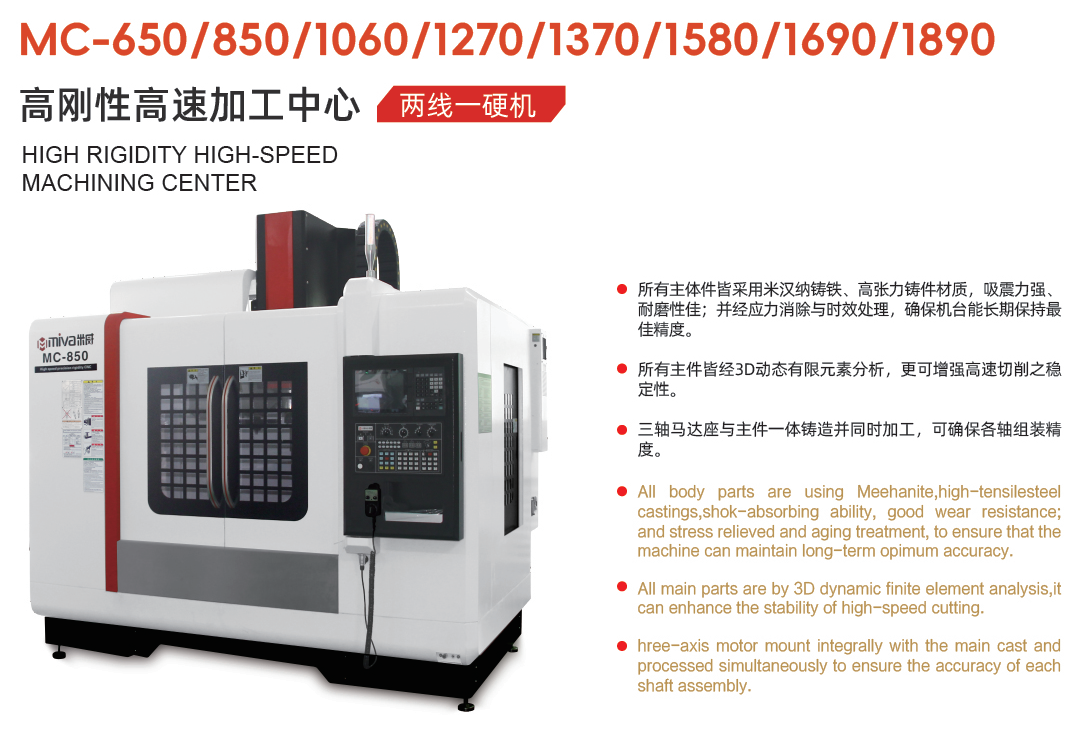 所有主体件皆采用米汉纳铸铁、高张力铸件材质,吸震力强耐磨性佳;并经应力消除与时效处理,确保机台能长期保持最佳精度。 所有主件皆经3D动态有限元素分析,更可增强高速切削之稳定性。 三轴马达座与主件一体铸造并同时加工,可确保各轴组装精度。