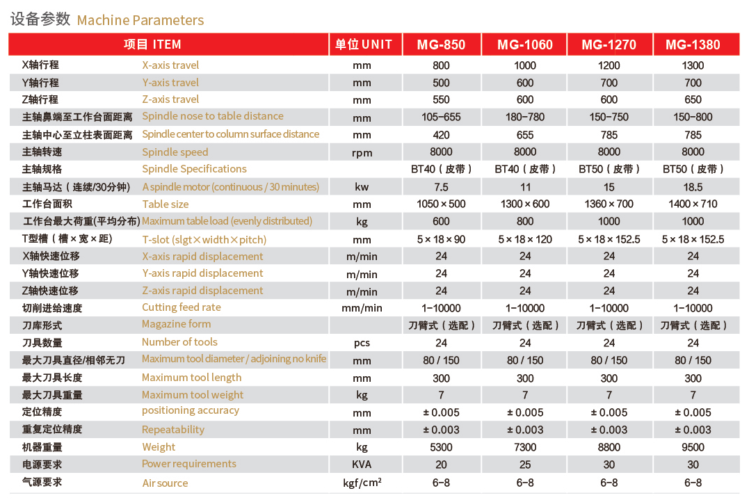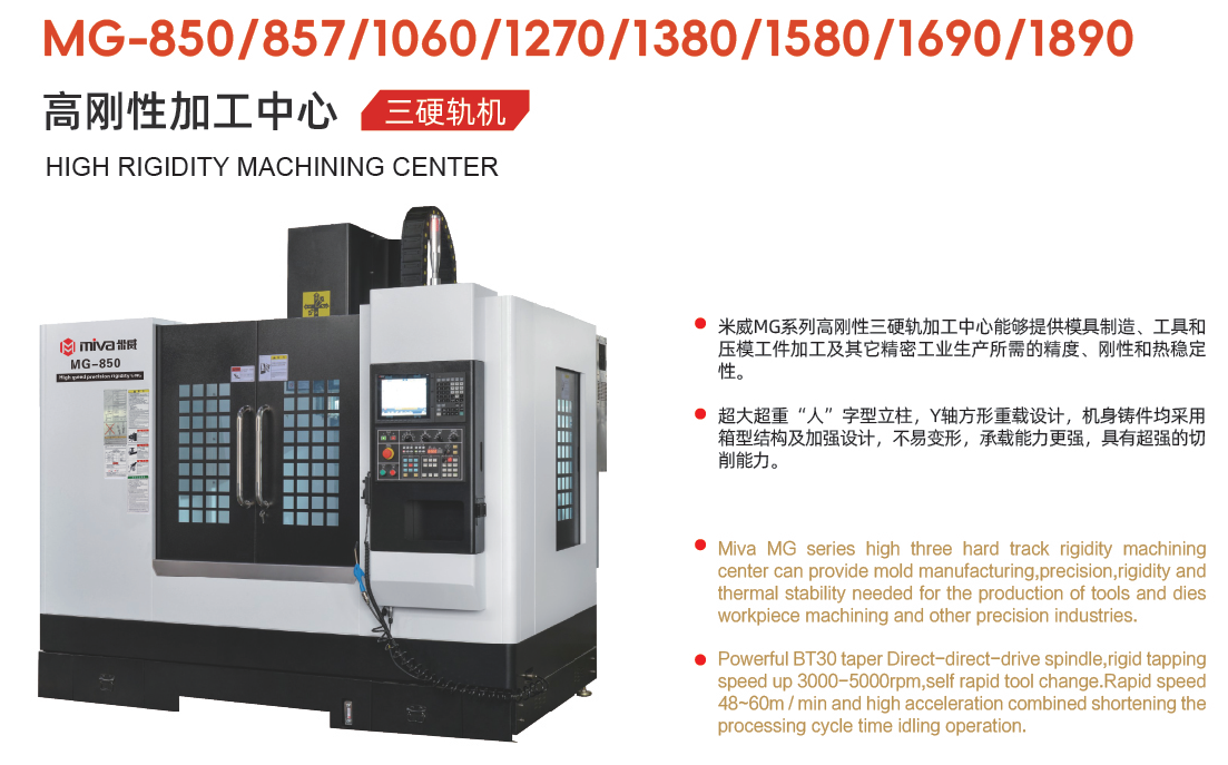 米威MG系列高刚性三硬轨加工中心能够提供模具制造、工具和压模工件加工及其它精密工业生产所需的精度、刚性和热稳定性。 超大超重“人”字型立柱,Y轴方形重载设计,机身铸件均采用箱型结构及加强设计,不易变形,承载能力更强,具有超强的切削能力。