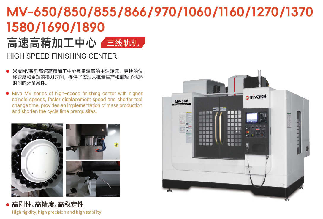 米威MV系列高速高精加工中心具备较高的主轴转速、更快的位移速度和更短的换刀时间,提供了实现大批量生产和缩短了循环时间的必备条件。